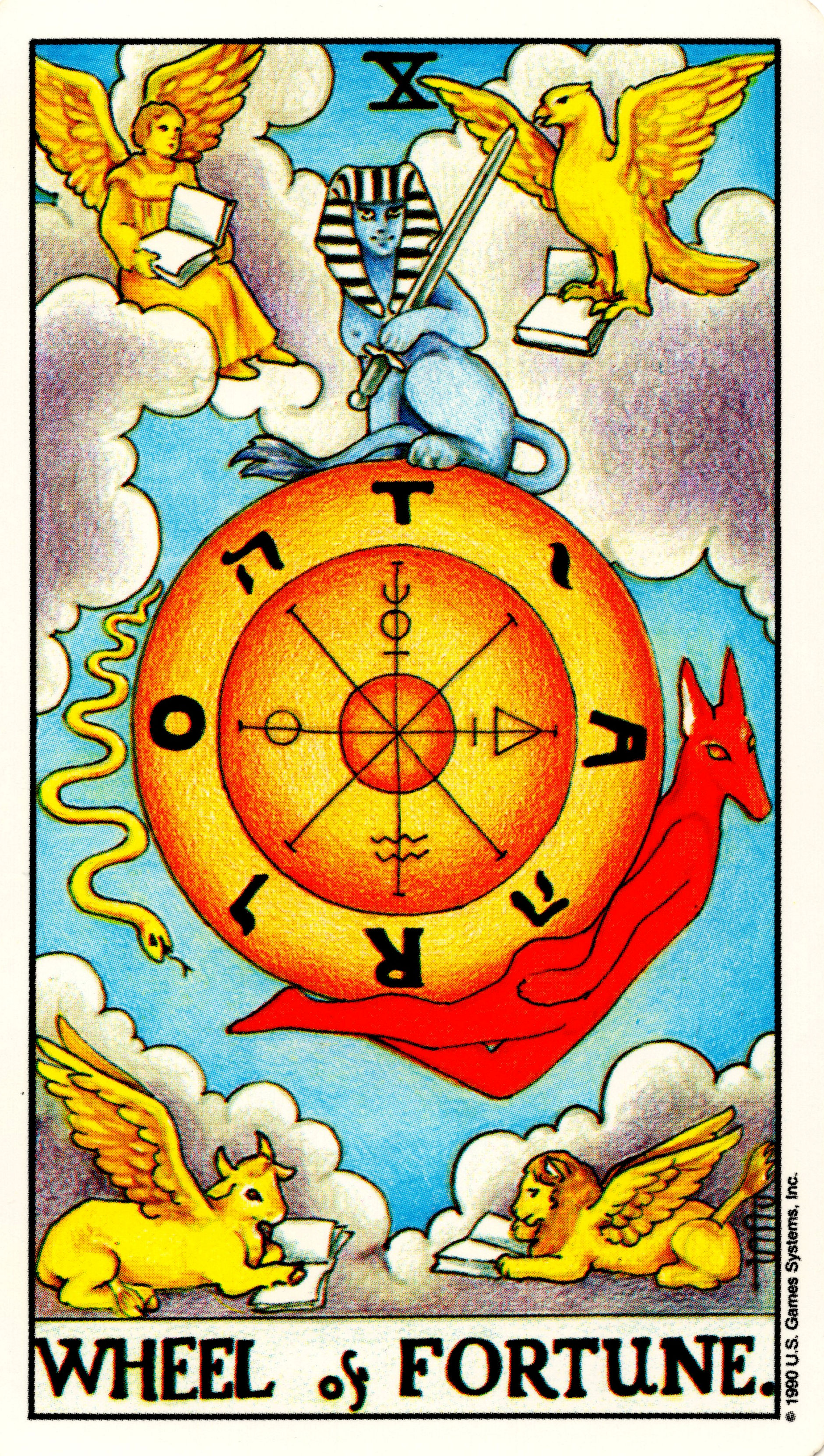 이 카드의 그림은 기독교 성경의 에스겔서 1장의 내용을 서사하고 있습니다. 메이져 카드 중 처음으로 인물이 등장하지 않은 카드입니다. 핵심적인 키워드가 ‘운’을 이야기하고 있습니다. 운은 긍정과 부정을 늘 내포하고 있으며 바퀴가 돌아감에 따라 올라갈 수도 내려갈 수도 있다는 의미가 있습니다. 카드의 이름은 그리스로마신화에 나오는 행운의 여신 포르투나(Fortuna)에서 유래했습니다. 포르투나 여신은 바퀴를 돌리는 일을 맡았다고 합니다.