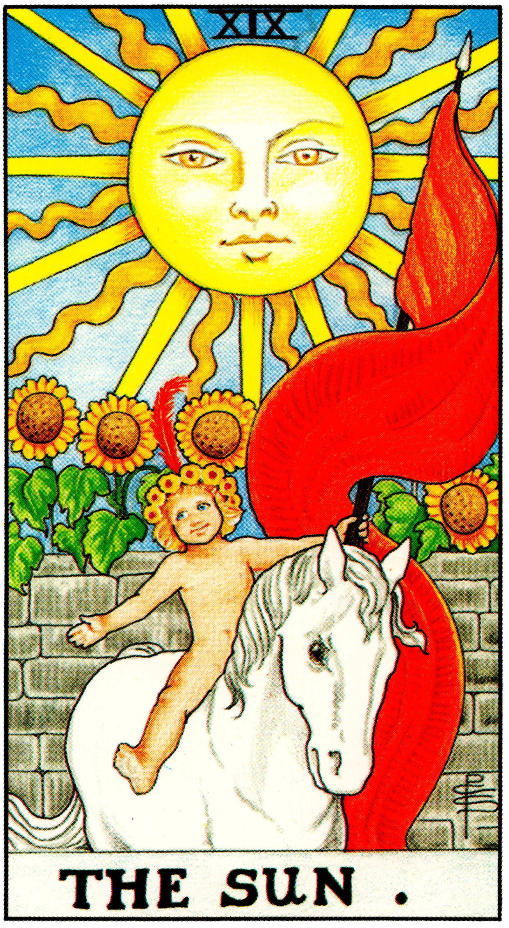 지구의 모든 생명체는 태양을 먹고 자랍니다. 태양을 무한에 가까운 에너지를 지구로 보내고 있습니다. 그 태양 에너지를 식물의 엽록체가 합성해 잎사귀와 열매의 녹말을 만듭니다. 녹말은 초식동물들이 먹습니다. 풀과 열매를 먹은 초식동물은 그 에너지를 단백질로 합성해 자기 자신을 성장시킵니다. 근본을 찾으면 초식동물들도 태양 에너지를 먹는 것입니다. 육식동물들은 그 초식동물들을 잡아먹습니다. 육식동물도 마찬가지로 그 근원을 찾아가며 태양 에너지를 먹고 성장하는 것입니다. 사람도 마찬가지입니다. 똑같이 태양 에너지를 먹고 자라는 것입니다. 태양은 우리에게 대가 없이 생명의 에너지를 전달해주는 아주 아주 따뜻한 존재입니다. 카드의 그림을 살펴보면 구름 한 점 없는 푸른 하늘에 빛나는 태양 그 아래 해바라기 화단, 알몸으로 백마 위에 올라탄 아이, 아이의 표정에도 드러나듯 즐거움과 기쁨에 가득 차 있는 모습이 보입니다. 밝고 따뜻한 에너지를 가진 카드입니다. 가장 긍정적인 카드라고 말할 수 있습니다. 그러나 아무런 보호장비가 없는 아이가 옷도 입지 않고 말 위에서 깃발을 들고 앉아 있는 모습은 천진난만한 아이의 표정과는 달리 보는 사람들에게 위태롭고 불안함을 느끼게 합니다. 따라서 순탄한 과정에 있다가도 예상치 못한 변수가 생기면 그대로 떨어질 수 있음을 주의해야 합니다. 그리스로마신화에서는 아폴로 신을 생각할 수 있습니다. 제우스와 레토 사이에 태어난 아들로 아르테미스와는 쌍둥이 남매입니다. 태양과 음악, 시 예언, 의술과 궁술을 관장하는 신으로 특히 앞날의 일들을 예언하는 신으로 유명합니다. 태양의 신으로서 세상을 밝혀 주는 것처럼 어두운 길을 밝히는 이성을 상징하고 누구에게나 평등하게 빛을 비추고 조화를 유지하고 있습니다. 다재다능하며 얼굴까지 잘생겨서 영미권에서는 아폴론이라 하면 잘생긴 남자의 대표단어로 쓰고 있다고 합니다.