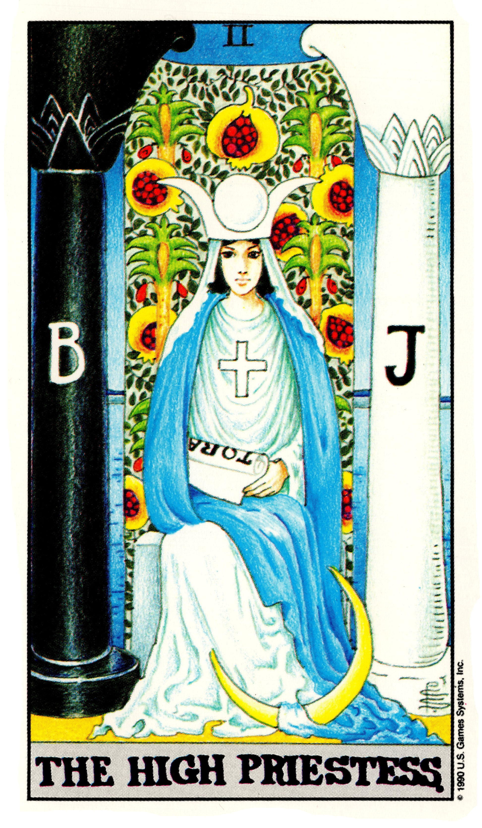 하늘의 신비한 지혜를 땅에 사람에게 전하는 전승자로 깊이 있는 맑고 강한 내공의 소유자인 여사제입니다. 그녀의 모습을 보면 오랜 기간 수행한듯한 조용하고 고요한 반듯한 자태가 두드러집니다. 이 모습에서 강한 소신과 생각이 보이지만 그것이 때론 강한 고집처럼 느껴지기도 합니다. 웨이트 카드덱 외의 다른 카드에서는 ‘수녀원장’이라는 키워드도 있었습니다. 글로 쓰여있지 않은 지혜를 나눠주는 전승이라는 키워드도 가지고 있습니다. 배경을 보면 흰색과 검은색의 기둥이 보이는데 자기 뜻과 다른 사람은 받아들이지 못한다는 흑백 논리를 의미하기도 합니다. 기둥 사이 천에는 석류 열매와 종려나무의 무늬가 새겨진 가림막이 걸려 있습니다. 이 무늬들은 남녀의 성을 상징하기도 합니다. 이를 등지고 있기에 고결함이라는 의미도 가집니다. 여사제는 알려지지 않은 지혜를 가르쳐 주는 카드입니다. 가르침과 전수라는 방법보다 조언의 방법으로 지혜를 전달해 줍니다.