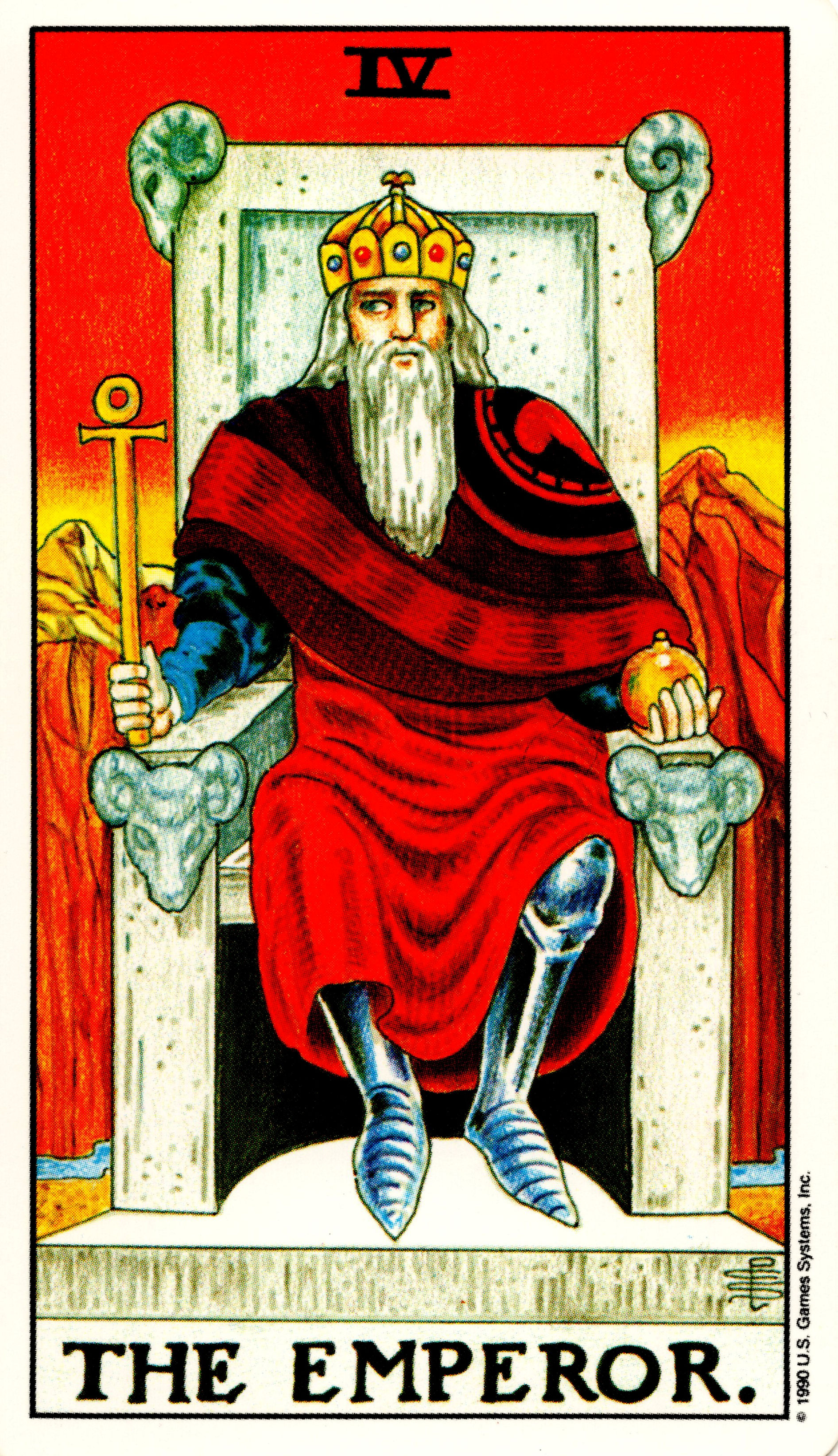 황제 카드는 여황제 카드의 반대 성격의 소유자입니다. 여황제가 모성에 특화되어 있다면 황제 카드는 부성을 상징하기도 합니다. 초기 마르세유 덱에 나오는 황제는 신성로마제국 황제인 오토 1세를 묘사했다고 합니다. 황제의 역할을 제대로 하고 있다면 현실 세계 안에서 결정의 권한자이며 행동을 주도하는 자이고 자신의 영역을 넓혀가는 고전적인 진취적 아버지상이라 말할 수 있을 것입니다. 스스로 판단력이 없는 부적합한 황제라면 틀에 박힌 권위주의적이며 소통할 수 없는 독불장군형 꼰대로 볼 수도 있을 것입니다.